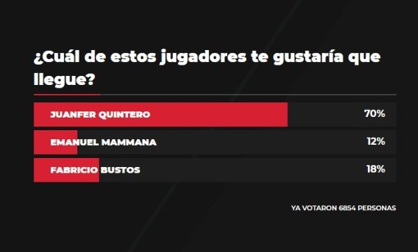 La Página Millonaria le propuso a los hinchas que voten y elijan respecto a qué posible refuerzo desean que llegue, las opciones de la encuesta eran Juan Fernando Quintero, Emanuel Mammana y Fabricio Bustos. Con un total de 6854 votos el 70% optó por el colombiano mientras que un 18% votó por Fabricio Bustos y un 12% por Emanuel Mammana. No caben dudas que la gran mayoría de los fanáticos quieren que lleguen los tres, pero de manera categórica se inclinaron por el regreso del hombre que anotó uno de los goles más importantes de la historia de River: Juan Fernando Quintero.
