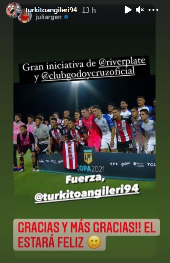 La previa del partido entre River y Godoy Cruz fue emotiva, los 22 futbolistas utilizaron un brazalete negro, hubo un minuto de silencio y los dos equipos se tomaron una foto juntos con la camiseta de Angileri sostenida por Enzo Pérez, dicho gesto fue agradecido por el lateral que se encontraba viendo el partido con su familia. Pero además hubo dedicatorias de sus compañeros que contaron lo duro que fue el proceso de las últimas dos semanas y le enviaron el pésame a la familia.