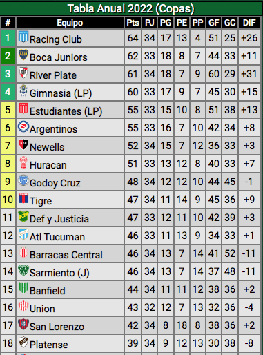 Entre River (32) y Gimnasia (36, con un partido menos) hay solo cuatro puntos de diferencia, pero en el medio están los equipos antes mencionados. ¿Qué necesita River para que el camino no se vuelva tan complejo de cara a los próximos fines de semana? Que Boca y Huracán se saquen puntos los dos (es decir, un empate), que Atlético Tucumán y Argentinos también empaten (el Bicho si gana se pone con 33 y lo pasa a River) y lógicamente que Gimnasia pierda para que no aumente aún más la brecha.