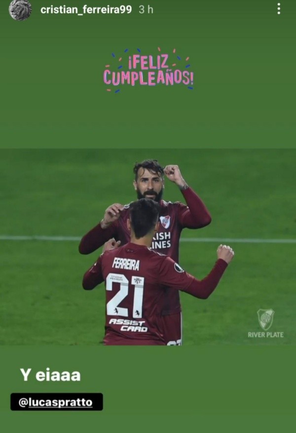 Además se sumaron a los saludos Nahuel Gallardo, Cristian Ferreira y Elías López, tres con los que compartió plantel en River, quienes subieron historias en Instagram saludando al Oso y usando algunas frases en código con las que solían divertirse en las concentraciones, teniendo en cuenta que Lucas siempre fue de los más graciosos del plantel. ¡Feliz cumple, Oso!