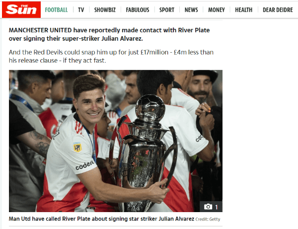Según el diarioinglés The Sun, el Manchester United habría iniciado conversaciones en las últimas horas con la dirigencia de River por Álvarez y estarían dispuestos a abonar 17 millones de euros para quedarse con él en este receso, monto que difícilmente podría ser aceptado por River ya que la cláusula de salida del jugador es de 20 millones de la misma moneda y no piensan dejarlo ir por menos de ese número.