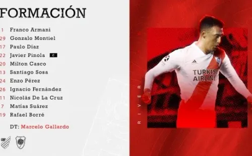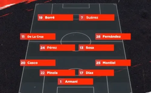 De esta manera, la formación que saldrá a jugar en el estadio Arena Da Baixada será compuesta por: Armani; Montiel, Díaz, Pinola, Milton Casco; Ignacio Fernández, Sosa, Enzo Pérez, De La Cruz; Matías Suárez y Rafael Borré.
