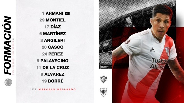 De esta manera, River saldrá a la cancha con: Franco Armani; Gonzalo Montiel, Paulo Díaz, Héctor David Martínez; Fabrizio Angileri; Agustín Palavecino, Enzo Pérez, Milton Casco; Julián Álvarez, Rafael Borré y Nicolás De La Cruz. En principio el uruguayo se sumaría como un tercer delantero arrancando desde la izquierda.