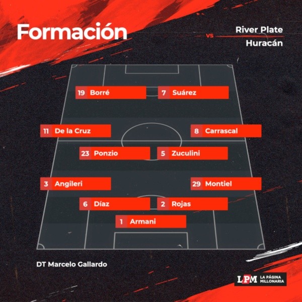 El once que confirmó Gallardo es: Franco Armani; Gonzalo Montiel, Robert Rojas, Paulo Díaz, Fabrizio Angileri; Nicolás De La Cruz, Leonardo Ponzio,Zuculini, Jorge Carrascal; Matías Suárez y Rafael Borré.Lo que confirma la vuelta al equipo del habitual arquero titular en reemplazo de Enrique Bologna que respondió de manera excelente en los partidos que le tocó atajar y también se confirma que Gallardo irá por la Copa Diego Maradona ya que utiliza a casi todos sus titulares. Es el mismo equipo que enfrentó a Nacional el pasado jueves por la Copa Libertadores.