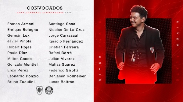 Además también está presente Julián Álvarez, quien había quedado marginado del Superclásico del fin de semana por una dorsalgia y es otro de los que puede sumar minutos mañana frente a los brasileños. El plantel realizará desde las 17 el último entrenamiento antes del partido, y allí tanto Casco como Álvarez serán exigidos. Cabe destacar que esta llave contra Palmeiras se cerrará el próximo martes en el estadio Allianz Parque de San Pablo, y que el ganador esperará por el vencedor de Boca y Santos para disputar la final en el Maracaná el 30 de enero.