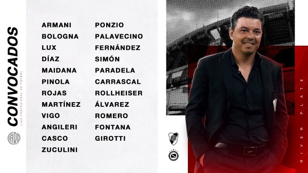 Si bien el DT cuenta con la mala noticia de la ausencia de Enzo Pérez por acumulación de tarjetas amarillas y de Felipe Peña por la expulsión ante Talleresaparecieron buenas nuevas en las últimas horas, debido a que tanto Paulo Díaz como Fabrizio Angileri ya recibieron el alta médica y podrán ser de la partida en caso que él lo considere. De esta manera se abren tres interrogantes para la formación titular: quiénes serán los laterales, quién será el reemplazante de Enzo, y finalmente quién acompañará a Álvarez en la delantera.