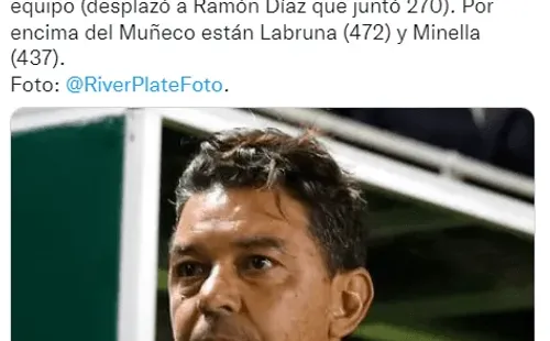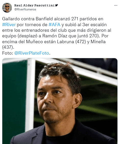 Ocho años después de aquel momento, Marcelo Gallardo volvió a superarse a sí mismo y también a Ramón. Con la victoria ante Banfield en el Florencio Sola, alcanzó los 271 partidos como ténico de River en torneos de AFA y alcanzó otra marca récord. El Muñeco dejó atrás al riojano, que quedó con 270 encuentros, y se subió al podio. Ahora quedó detrás de Ángel Labruna (472) y José María Minella (437), informó la cuenta de @RiverNumeros en Twitter. Napoleón sigue haciendo historia y ahora va por más.