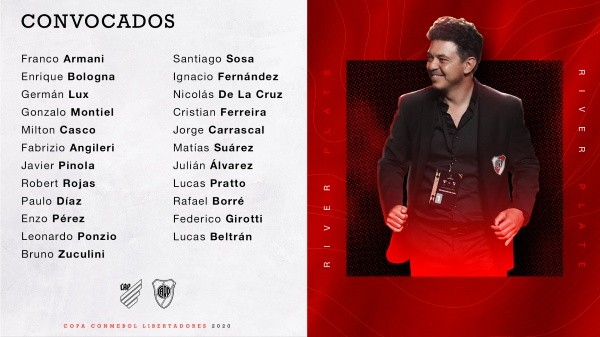 Franco Armani, Gonzalo Montiel, Javier Pinola, Enzo Pérez, Ignacio Fernández, Nicolás De La Cruz y Matías Suárez tienen su lugar asegurado. Lo mismo pasará con Rafael Borré si Gallardo lo ve al 100% luego de su desgarro, caso contrario Pratto podría ocupar su lugar o pueden ingresar Sosa o Ponzio para sumar un volante. Los tres nombres restantes por ahora son una incógnita que el Muñeco develará en las próximas horas.