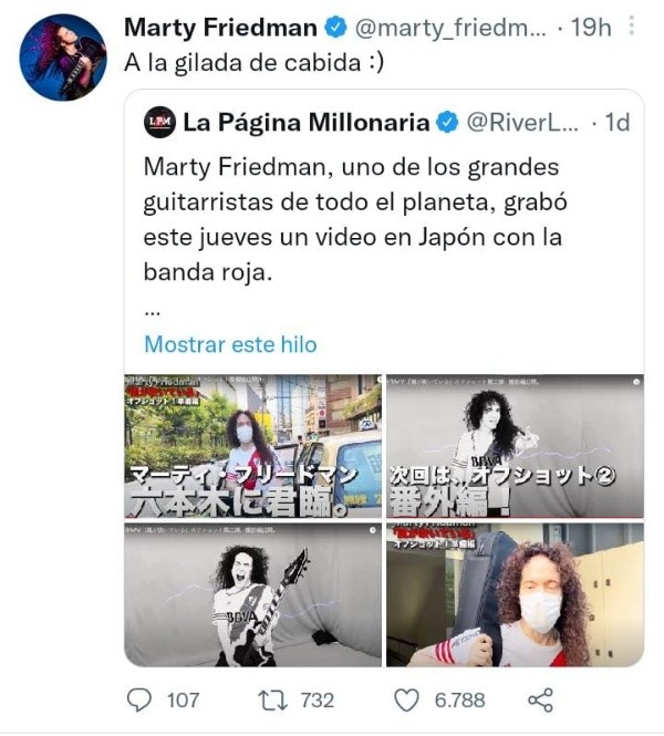 Marty Friedman es uno de los mejores guitarristas de las últimas décadas. Además de ser sumamente virtuoso y talentoso se hizo popularmente conocido cuando integró una de las bandas pesadas más populares del mundo: Megadeth. Ya alejado de la agrupación, Friedman se mudó a Japón y en las últimas horas se dio a conocer un video que sorprendió al mundo River.