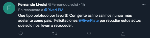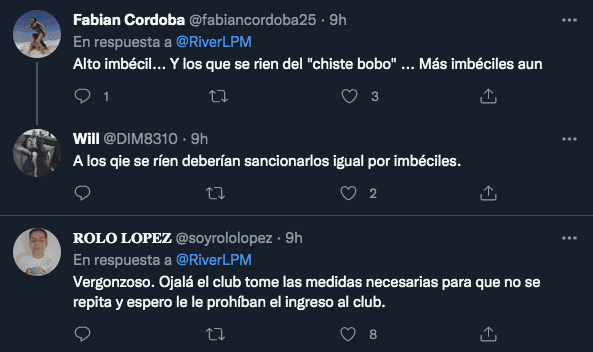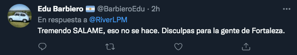 Un inadaptado no representa a todos los hinchas de River y así lo hicieron saber el resto delos fieles al Más Grande en las redes sociales, dejando en claro que este hecho es inadmisible, pidiendo que el hombre no pueda entrar más al club y además ofreciéndole disculpas a la gente de Fortaleza que tuvo que soportar este acto de racismo.