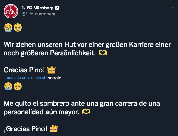 Debajo de ese tweet, la cuenta oficial del conjunto alemán compartió otro mensaje en la que etiquetaron a Pinola y posteó una foto suya con la camiseta del equipo y la palabra leyenda. “Puedes estar orgulloso de ti mismo”, dice el tweet.