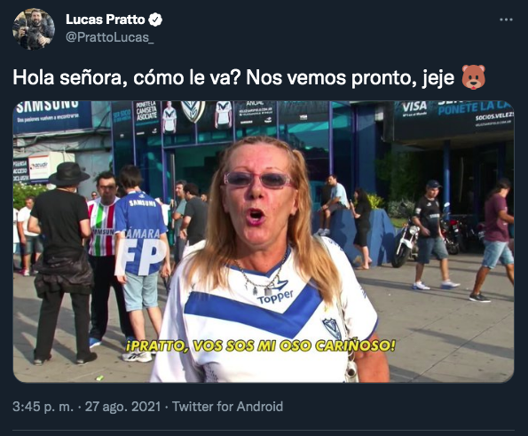 Además de subir una foto mientras pasaba por el Estadio José Amalfitani, el delantero sacó de la galera una reconocida imagen de una mujerhincha de Vélez que, hace algunos años, había dicho en televisión que su ídolo era Pratto. “Hola señora, cómo le va? Nos vemos pronto, jeje”, le escribió el atacante en Twitter, confirmando qué regresará al club en el cual es muy querido, esperando recibir el alta médica -mediados de septiembre- y así poder devolverles la confianza como ya supo hacerlo: con golez. ¡Todos los éxitos del mundo Lucas!