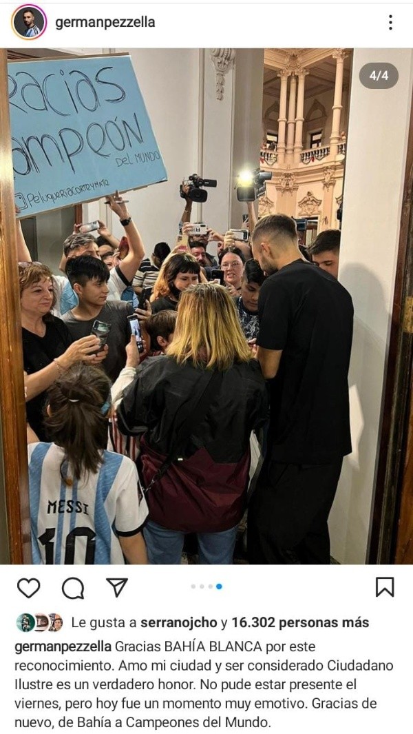 Luego del reconocimiento, el defensor de la Selección Argentina utilizó su cuenta de Instagram para compartir algunas imágenes del evento y agradecer por el cariño recibido: “Gracias Bahía Blanca por este reconocimiento. Amo mi ciudad y ser considerado Ciudadano Ilustre es un verdadero honor. No pude estar presente el viernes, pero hoy fue un momento muy emotivo. Gracias de nuevo, de Bahía a Campeones del Mundo”, expresó el ex River. Otro protagonista de la Scaloneta que es profeta en su tierra.