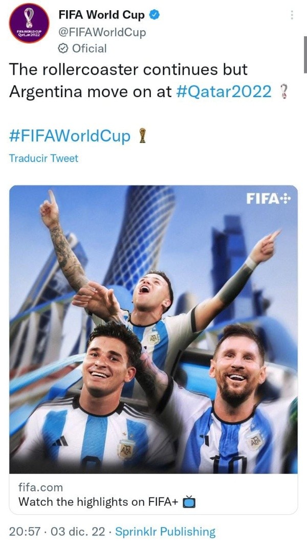 Esta vez, después del triunfo 2-1 frente a Australia, la cuenta que le dejó un pequeño guiño a los hinchas millonarios fue la oficial del Mundial, que tiene más de once millones de seguidores. Felicitaron a Argentina por su pasaje a los cuartos de final y en el diseño que publicaron utilizaron las figuras de Lionel Messi, Enzo Fernández y Julián Álvarez, porque River está en todos lados.