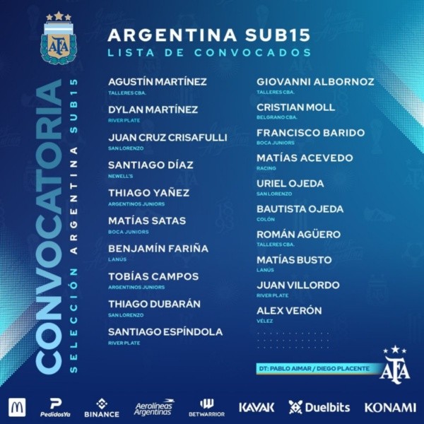 El semillero de Nuñez continúa dando sus frutos en las diferentes categorías de la Selección Argentina. En la mayor están Julián Álvarez, Enzo Fernández, Exequiel Palacios y compañía. En la Sub-20 aparece Axel Encinas representando al Más Grande, Claudio Echeverri y Ulises Giménez están dejando su huella en la Sub-17 y ahora también habrá sangre riverplatense en el equipo Sub-15, dirigido por Pablo Aimar y Diego Placente, dos ex River.