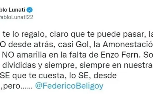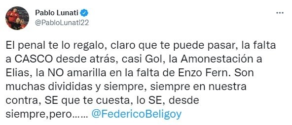 Pablo Lunati fue árbitro de Primera División por más de una década, es cierto que desde que se retiró se lo identifica más como hincha de River que como ex árbitro, pero la realidad es que en su cuenta de Twitter realiza análisis arbitrales en esta oportunidad lo hizo con Néstor Pitana: “El penal te lo regalo, claro que te puede pasar, la falta a CASCO desde atrás, casi Gol, la Amonestación a Elías, la NO amarilla en la falta de Enzo Fernández. Son muchas divididas y siempre, siempre en nuestra contra, SE que te cuesta, lo SE, desde siempre, pero…… @FedericoBeligoy”.