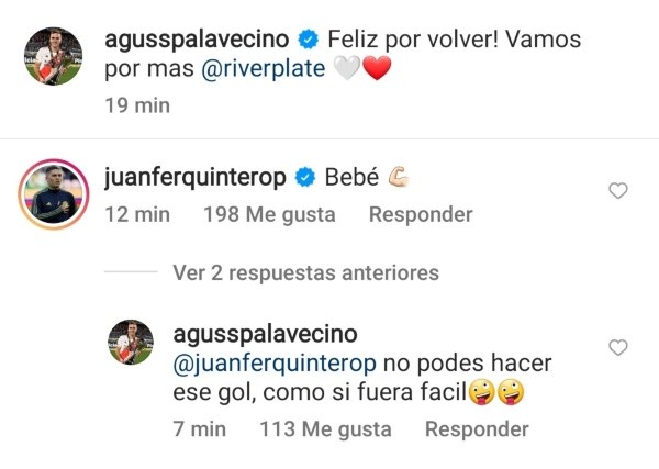 Agustín Palavecino estuvo ausente en los dos primeros partidos de la Copa de la Liga que fueron ante Unión y Patronato por una molestia en su rodilla izquierda, pero ante Newell’s volvió a aparecer entre los convocados y de hecho Gallardo le dio unos minutos sobre el final. Una vez terminado el partido el ex mediocampista de Deportivo Cali publicó en su cuenta de Instagram: “Feliz por volver! Vamos por más @RiverPlate”, a dicha publicación Juanfer comentó: “Bebe” y Palavecino le devolvió la pared con un gran elogio: “No podés hacer ese gol, como si fuera fácil”.