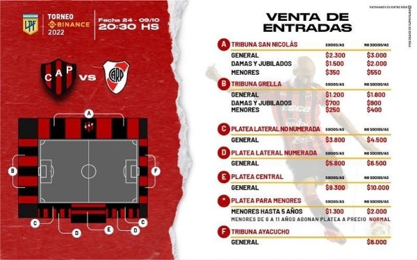 El próximo domingo River visitará a Patronato desde las 20.30 horas en Paraná por la fecha 24 de la Liga Profesional y los simpatizantes del Más Grande tendrán la posibilidad de asistir al estadio Prebístero Bartolomé Grella bajo la figura del público neutral. Este mediodía, el club entrerriano lanzó a la venta las entradas destinadas a los no socios a través de la plataforma web de Boletería Vip. El precio de las localidades es de $6000 pesos.