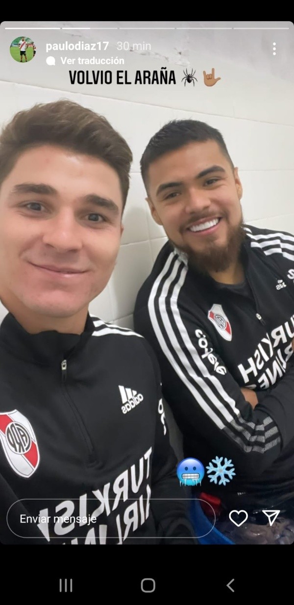Paulo Díaz es uno de los futbolistas con mayor interacción en las redes sociales y este sábado, tras la gran goleada ante Sarmiento, el chileno compartió una foto desde el vestuario con Julián Álvarez. El marcador central agregó en su historia la frase “volvió el Araña” y además dos emojis para demostrar el frío que estaban pasando. Hay que recordar que el cordobés rompió una sequía goleadora de siete partidos sin marcar.