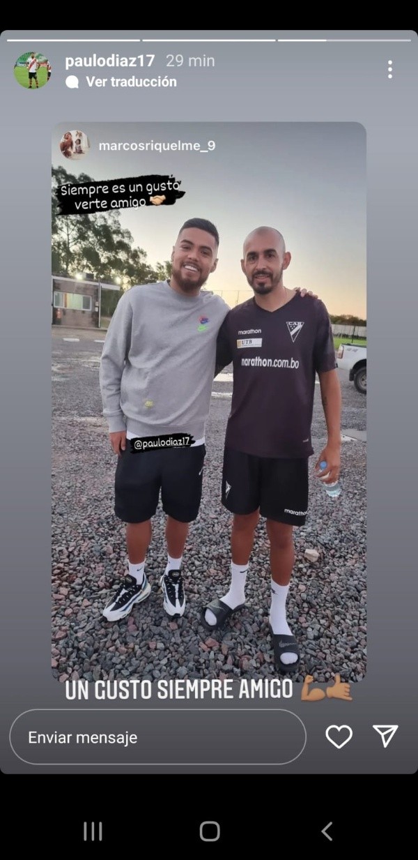El marcador central del Más Grande se cruzó con Riquelme en el River Camp y además de sacarse una foto estuvieron charlando un rato largo. Su amistad nació en Palestino cuando Paulo Díaz daba sus primeros pasos en Primera en 2014 Riquelme llegó al conjunto chileno. Fueron compañeros hasta 2015 cuando Paulo pasó a defender la camiseta de Colo Colo pero la amistad perduró con los años.