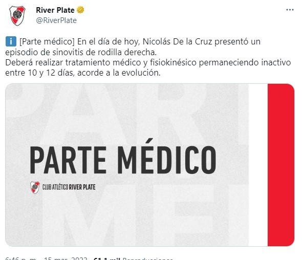 Unas horas más tarde, el Más Grande dio a conocer un parte médico que encendió las alarmas: Nicolás De La Cruz presentó una sinovitis en su rodilla derecha que le impidió trabajar con normalidad. El volante uruguayo deberá realizar un tratamiento médico y fisiokinésico que lo obligará a estar inactivo. ¿Cuánto tiempo? Entre diez y doce días, de acuerdo a la evolución que vaya teniendo en el día a día.