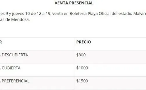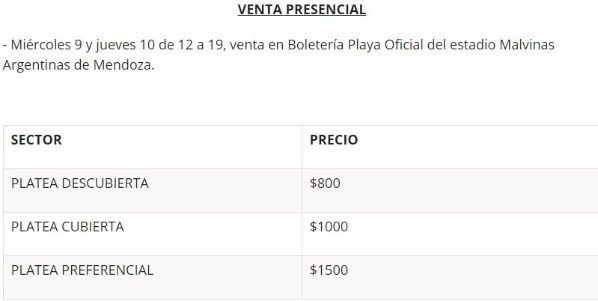 Además,en Mendoza hay venta presencial hasta este jueves10 de octubre, de 12 a 19 horas. El expendio en la Boletería Playa Oficial del estadio Malvinas Argentinas.
