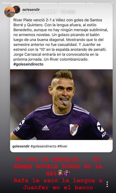 Luego de picar la pelota de manera sublime para poner a River en ventaja en Liniers, Rafael Borré salió corriendo hacia un costado y comenzó a sacar la lengua en el festejo, acompañado por una sonrisa. En ese momento, muchos creyeron que se trataba de una burla al famoso festejo de Darío Benedetto en la final de la Libertadores en Madrid, pero rápidamente la novia del colombiano aclaró la situación.