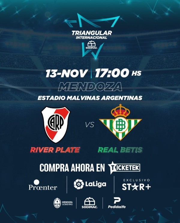 El Millonario hizo su debut en el triangular internacional frente a Colo Colo en Viña del Mar, pero todavía resta una última función para la despedida de Marcelo Gallardo. El próximo partido será ante Real Betis, el 13 de noviembre en el Estadio Malvinas Argentinas de Mendoza. El encuentro está pautado para las 17 horas y será transmitido por la plataforma de Star + de manera exclusiva.