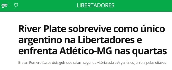 Los principales medios de aquel país destacaron la gran victoria del Más Grande, puntualizando en su mayoría que es el único equipo argentino sobreviviente en la competencia y que será un hueso duro de roer para el equipo de Belo Horizonte que viene de eliminar a Boca por penales esta semana y que cuenta en sus filas ni más ni menos que con Ignacio Fernández. “El delantero Braian Romero fue el héroe de la noche”, destacó el sitio Globo Esporte.