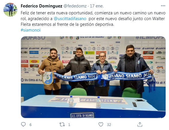 Ya recuperado del cáncer, un nuevo desafío comenzó en la vida del ex lateral por izquierda. A los 44 años se embarcó rumbo a Italia, más precisamente a la ciudad de Fasano, en el sur de Italia, para asumir –junto a Walter Fleita- en la gestión deportiva del U.S. Città di Fasano, club que milita en la Serie D.