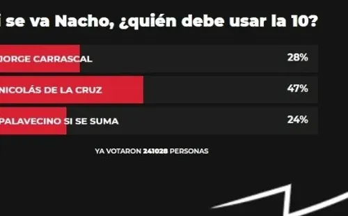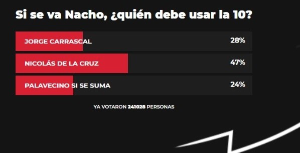 En la encuesta realizada por “La Página Millonaria” en los últimos días sobre el sucesor de la camiseta número 10 post Nacho fue el uruguayo el que se llevó la mayor parte de los votos por parte de la gente. Casi la mitad de los hinchas, el 47% para ser más preciso, se inclinó por De La Cruz. El segundo lugar del podio fue para Carrascal con el 28%, mientras que Palavecino sumó el 24% de la voluntad popular.