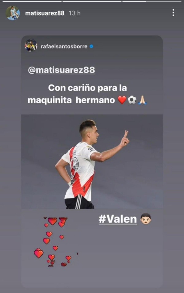 La dedicatoria de Rafael Borré y la respuesta de Matías Suárez (Captura)