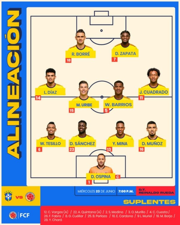 El duelo es correspondiente a la cuarta fecha del Grupo B de la Copa América el cual lidera Brasil con seis unidades, detrás aparece Colombia con 4 (producto de un empate y una victoria) y luego están Perú (4 puntos), Ecuador y Venezuela (2 puntos).Será un partido fundamental para Colombia que de ganar se ubicaría en la primera posición, pero cabe destacar que los del Profe Rueda enfrentarán a la mejor selección del continente que cuenta con grandes figuras como Neymar o Casemiro.