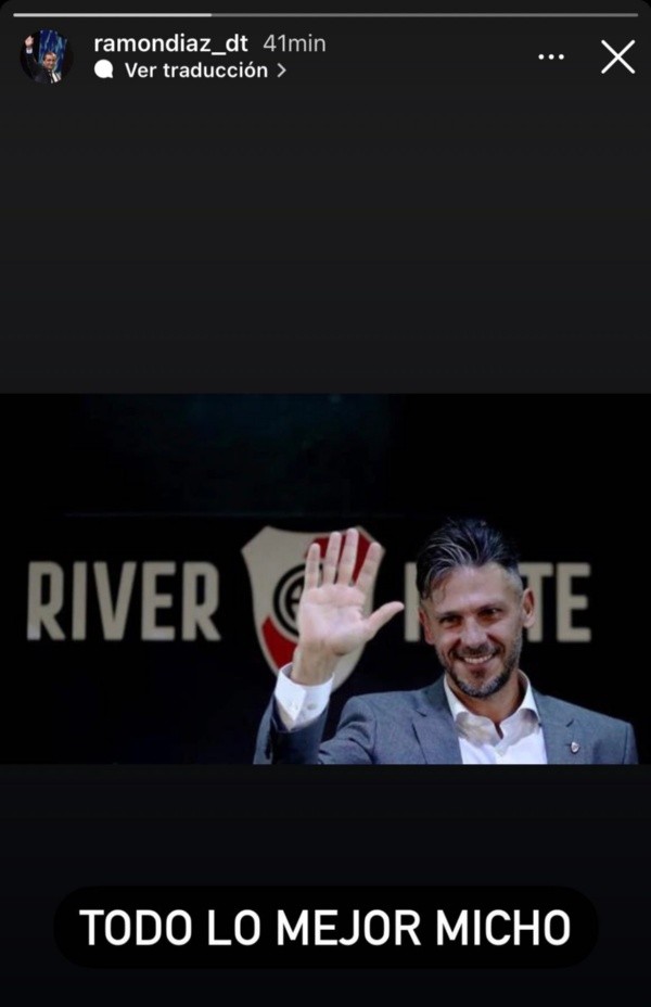 Entre los que se pronunciaron en redes por la llegada de Micho está Ramón Díaz, leyenda de la institución de Nuñez y amado por todos los riverplatenses. Esperó algunos días, pero el saludo del Pelado llegó. Esta mañana, subió una historia a su cuenta de Instagram con una foto de Demichelis y una frase simple pero que resume sus deseos: “Todo lo mejor Micho”, escribió el actual técnico del Al-Hilal de Arabia Saudita.