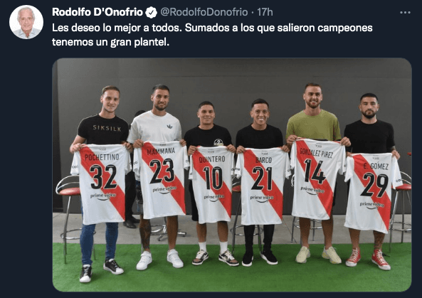 Rodolfo D’Onofrio, ex presidente de River, estuvo siguiendo de cerca el acto y se pronunció en su cuenta de Twitter acerca de las incorporaciones y, como todos los hinchas, manifestó estar ilusionado con los nombres que arribaron a Nuñez: “Les deseo lo mejor a todos. Sumados a los que salieron campeones tenemos un gran plantel”, escribió, seguido de una foto de los seis refuerzos posando con sus respectivas camisetas.