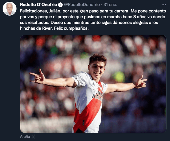D’Onofrio también le dedicó hace unos días un mensaje a Julián Álvarez luego de que se conociera su transferencia la Manchester City de Inglaterra: “Felicitaciones, Julián, por este gran paso para tu carrera. Me pone contento por vos y porque el proyecto que pusimos en marcha hace 8 años va dando sus resultados. Deseo que mientras tanto sigas dándonos alegrías a los hinchas de River. Feliz cumpleaños”.