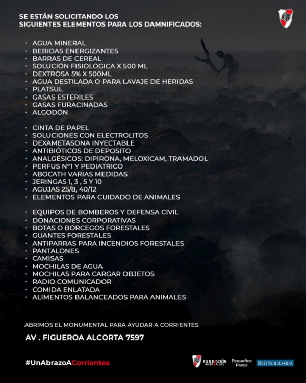 La provincia de Corrientes vive una situación dramática hace varios días y necesita de la ayuda de todo el país. La sequía extrema causó incendios rurales que ya consumieron un 9% del campo de la provincia y a pesar del esfuerzo de los bomberos, los mismos todavía no cesan. A raíz de esto, muchas personas debieron abandonar sus viviendas junto con los productores queperdieron la tierra fertil de sus campos por el fuego. En este marco, River impulsó una movida solidaria bajo el slogan “Un abrazo a Corrientes” buscando ayudar a todos los damnificados.