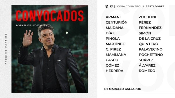 RIVER PLATE (4-1-3-2):Franco Armani; Andrés Herrera, Paulo Díaz, Héctor David Martínez, Milton Casco; Enzo Pérez; Santiago Simón, Enzo Fernández, Nicolás De La Cruz;Matías Suárez yJulián Álvarez.DT:Marcelo Gallardo.