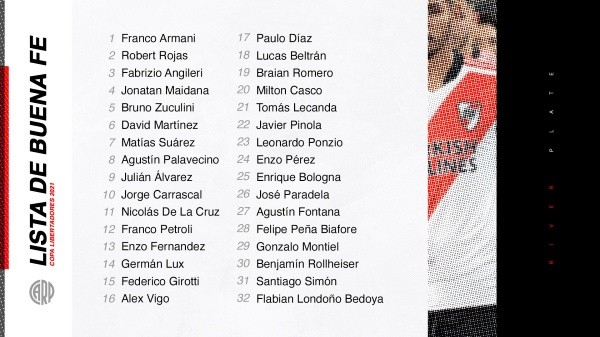 La mayor incógnita era definir quién iba a salir para dejarle su lugar a Enzo Fernández, el otro refuerzo del Millonario de cara al segundo semestre. Se especulócon que Ponzio podía abandonar la lista debido a la recuperación que deberá afrontar por la miocarditis, pero el rol delLeón en el vestuario es fundamental y necesario en cada partido, por esoestá en la nómina. Quien finalmente salió para dejarle el lugar a Fernández fue Tomás Castro Ponce, de pocos minutos en la Primera de River. Cabe destacar que, en caso de sumar un último refuerzo en estos días, River puede añadirlo a la lista presentando la documentación 48 horas antes del partido con Argentinos y pagando una multa.Además, si el equipo accede a cuartos de final, se podrán hacer tres nuevas modificaciones en los nombres.