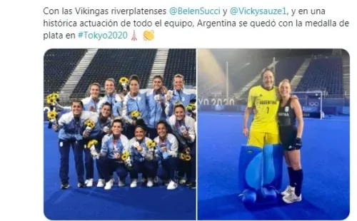 A través de las redes sociales, la cuenta oficial de River quiso agradecerle por el esfuerzo a todo el equipo argentino y también particularmente a Victoria Sauze y Belén Succi, una de las figuras de la final que tuvo atajadas más que interesantes y que nada pudo hacer ante los tres goles de Países Bajos que llegaron mediante tres córner cortos. ¡Felicitaciones, Leonas! Con las Vikingas Belén Succi y Vicky Sauze, y en una histórica actuación de todo el equipo, Argentina se quedó con la medalla de plata en Tokio 2020”, ese fue el mensaje que compartió el Más Grande en las redes.