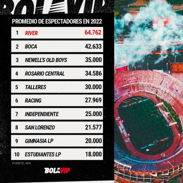 Según un informe publicado por la Asociación del Fútbol Argentino, River fue el club más convocante a lo largo de todo el año. Con un promedio de 64.762 hinchas por partido, el Millonario lidera la tabla de asistentes por un amplio margen. Muy atrás quedó Boca, con 42.633. La tercera y cuarta ubicación es para los equipos de Rosario: Newell’s cerró la temporada con 35.000, mientras que Central quedó ahí nomás, con 34.586. El quinto en cuestión es otro grande del interior: Talleres alcanzó los 30.000 y superó a Racing, Independiente y San Lorenzo.