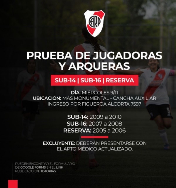 Para obtener un lugar en las mismas el club informó que todas las postulantes sin excepción deberán llenar un formulario vía web donde deberán completarlo con todos los datos personales requeridos. Y además deberán presentar el miércoles un certificado de apto médico actualizado, caso contrario no podrán formar parte de las pruebas.