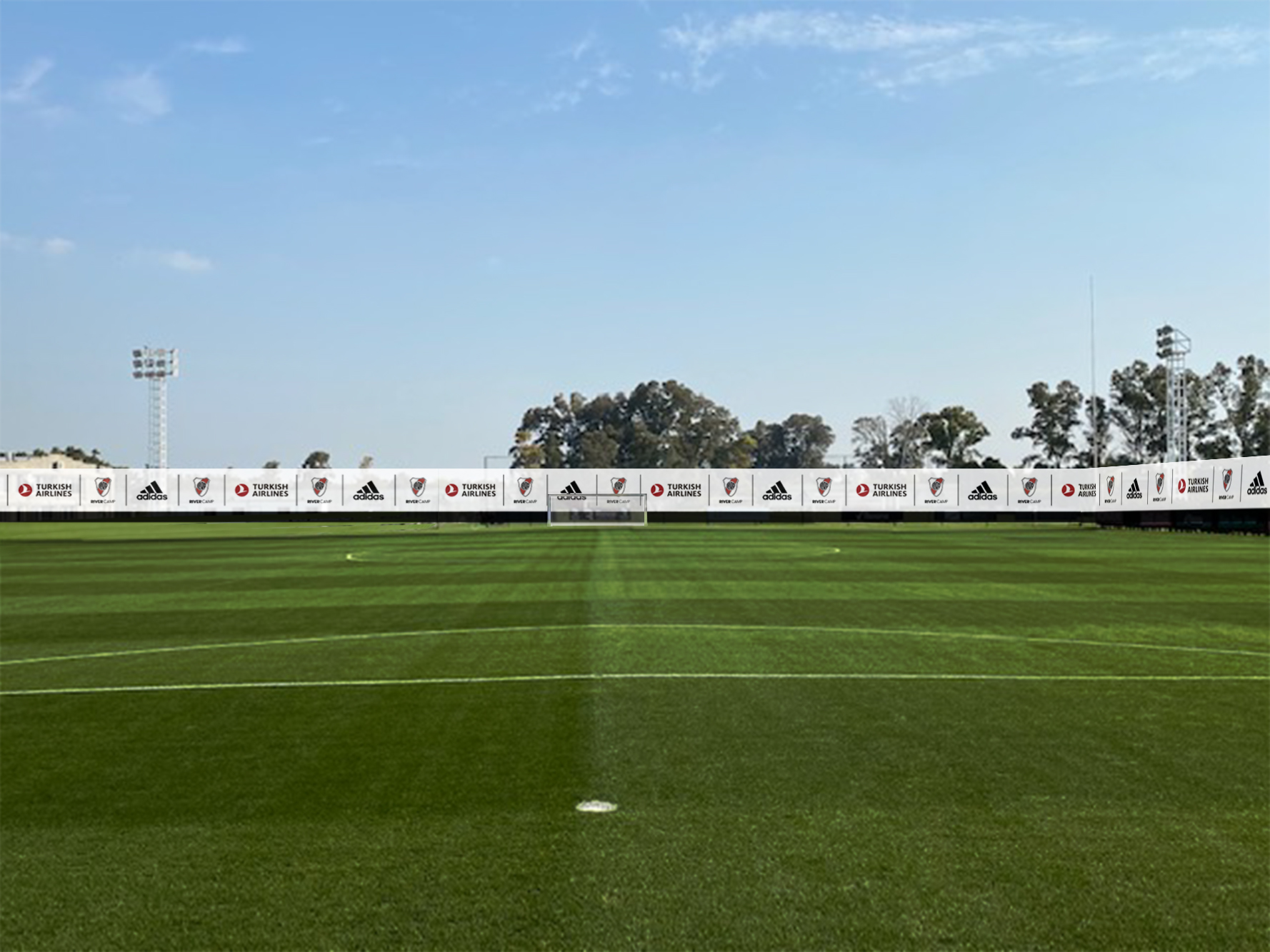 Y el otro cambio mayor que se verá en el predio es la tela mesh blanca, ploteada con el escudo de River y los logos de los sponsors principales, que rodeará a todo el campo de juego, por encima de lo que corresponde a la ubicación de la publicidad estática. Elobjetivo principal de que no se vean el resto de las canchas del River Camp o los árboles que están ubicados detrás del alambrado que queda frente a los bancos de suplentes. Si bien en algunos sectoresel alambrado ya tenía una altura superior de cuatro metros, ahora también se está elevando hasta esa medida la totalidad de los cuatro lados.