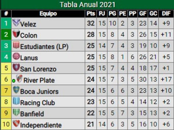 Colón ya está clasificado a la Libertadores 2022 por ser campeón de la Copa de la Liga 2021. Los tres primeros de esta tabla también irán a la Libertadores y los seis siguientes tendrán su lugar en la Copa Sudamericana.