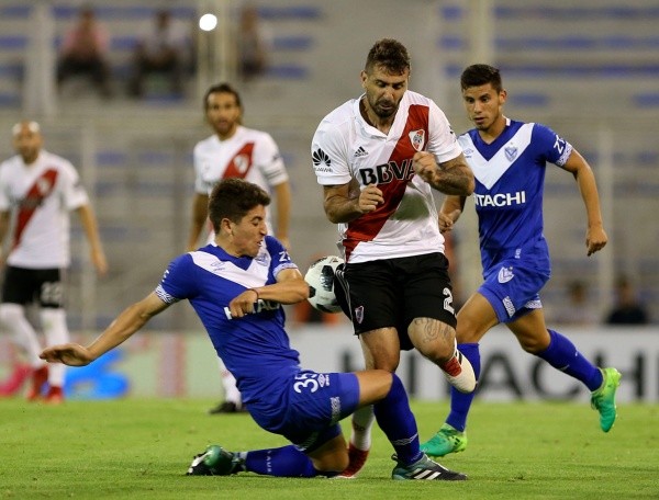 Cáseres frente a Pratto, en febrero del 2018: ganó Vélez 1-0, en Liniers.