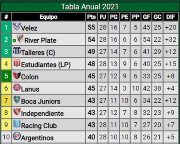 Colón ya está clasificado a la Libertadores 2022 por ser campeón de la Copa de la Liga 2021. Los tres primeros de esta tabla también irán a la Libertadores y los cuatrosiguientes tendrán su lugar en la Copa Sudamericana, además de Boca y Banfield, ya clasificados.