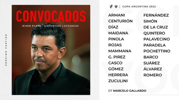 Suplentes: Ezequiel Centurión, Robert Rojas, Paulo Díaz, Leandro González Pírez, Jonatan Maidana, Milton Casco, Enzo Fernández, José Paradela, Santiago Simón, Esequiel Barco, Matías Suárez y Braian Romero.