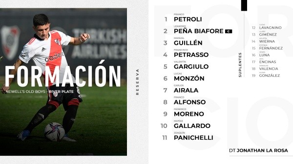 River enfrenta a Newell’s Old Boys por la fecha 13 del Torneo de Reserva. Los dirigidos por Jonathan La Rosa viajan a Rosario con la misión de estirar la buena racha, sumar su quinta victoria consecutiva y alejarse aún más en la cima de la tabla, que hoy tiene al Millonario como puntero con 27 unidades. Se juega desde las 11.00 en el Estadio Marcelo Bielsa. Seguí EN VIVO el partido.