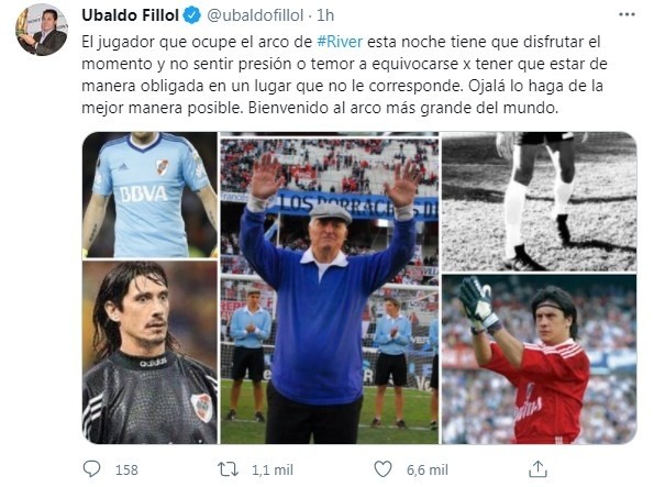 “El jugador que ocupe el arco de River esta noche tiene que disfrutar el momento y no sentir presión o temor a equivocarse por tener que estar de manera obligada en un lugar que no le corresponde. Ojalá lo haga de la mejor manera posible. Bienvenido al arco más grande del mundo”, escribió Ubaldo Fillol en sus redes sociales, el texto estuvo acompañado por una foto con grandes arqueros que tuvo River a lo largo de su historia: Amadeo Carrizo, Germán Burgos, Franco Armani, Marcelo Barovero, Nery Pumpido, Ángel David Comizzo y el propio Ubaldo Fillol. Todavía no se sabe quién será el arquero ante Santa Fe, aunque lo más probable es que sea Enzo Pérez, aunque también podría ser Miton Casco.