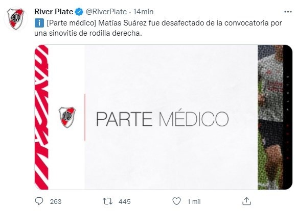 Increíble pero real, el Más Grande sufrió una baja de último momento antes de emprender viaje a Junín para enfrentar a Sarmiento por la novena fecha de la Liga Profesional. Matías Suárez había sido convocado para dicho encuentro pero finalmente no podrá estar por una sinovitis en su rodilla derecha. ¿Qué es una sinovitis? Es la inflamación de la membrana sinovial, esta afección ya la había tenido en Oreja en el mismo sector en abril de este año. Al ser una inflamación, no hay un tiempo concreto de recuperación, puede que en menos de una semana ya se haya mejorado como que lleve más tiempo, por lo que el cordobés también podría perderse el partido contra Independiente.